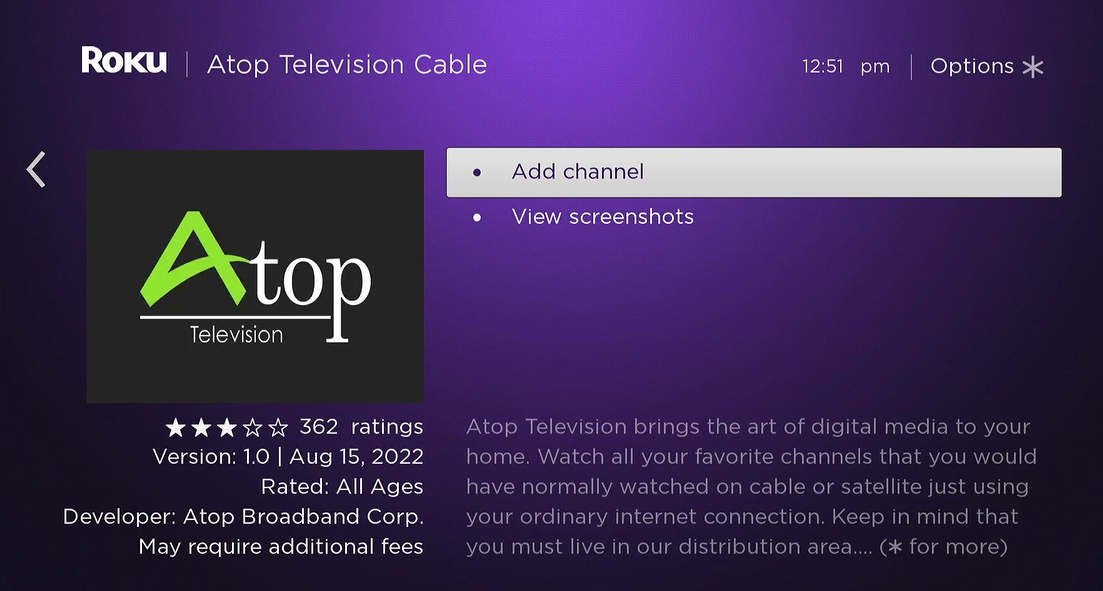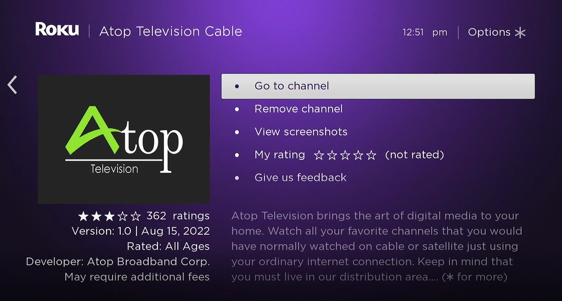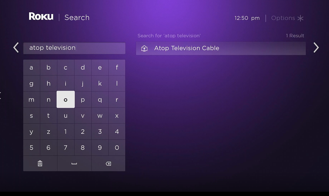 Step 2. Scroll down and highlight “Search”. Next, search for ”‘Atop Television Cable.” Then, highlight the app and press OK.