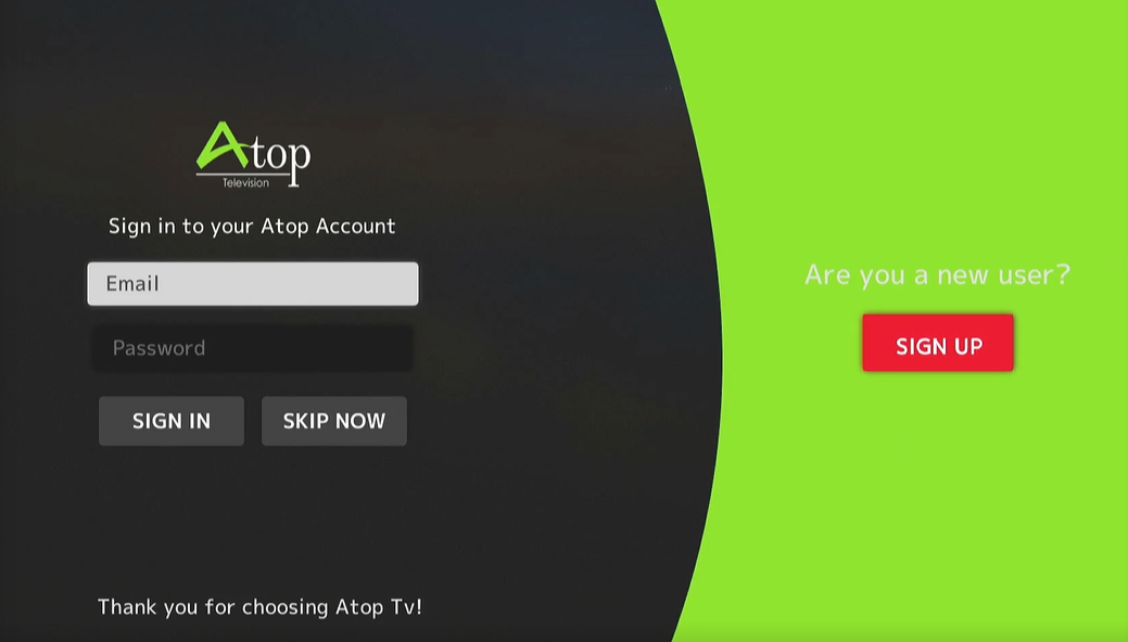 Step 4. Using the on-screen keyboard, enter your email and password (found on your service delivery email). Then, highlight “SIGN IN” and press OK. Note that the email address you enter on this form must be the same address you previously entered for your Netwire Fiber portal registration.