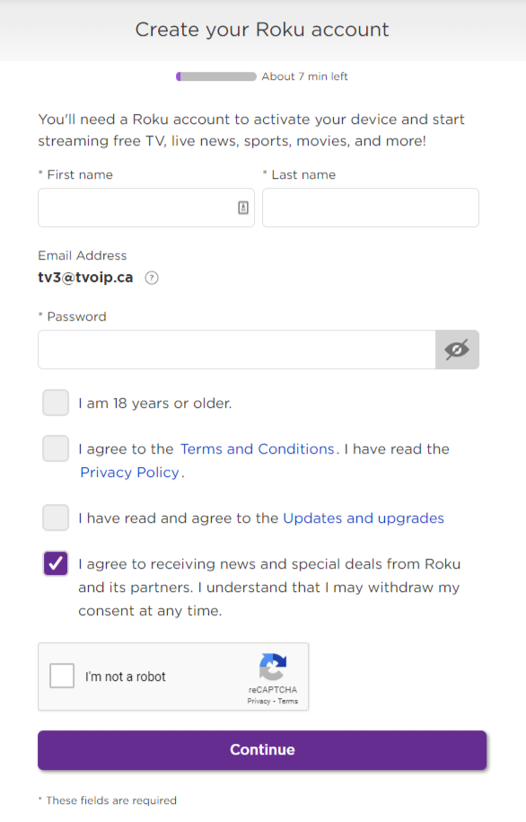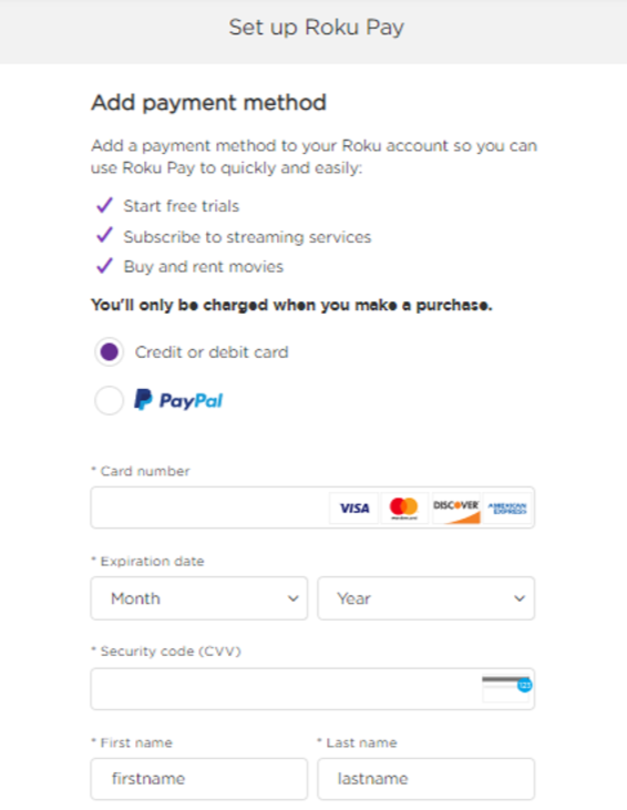 Step 6. To complete the activation of your account, Roku requires you to enter your billing information. Bear in mind that there is no charge for creating a Roku account.