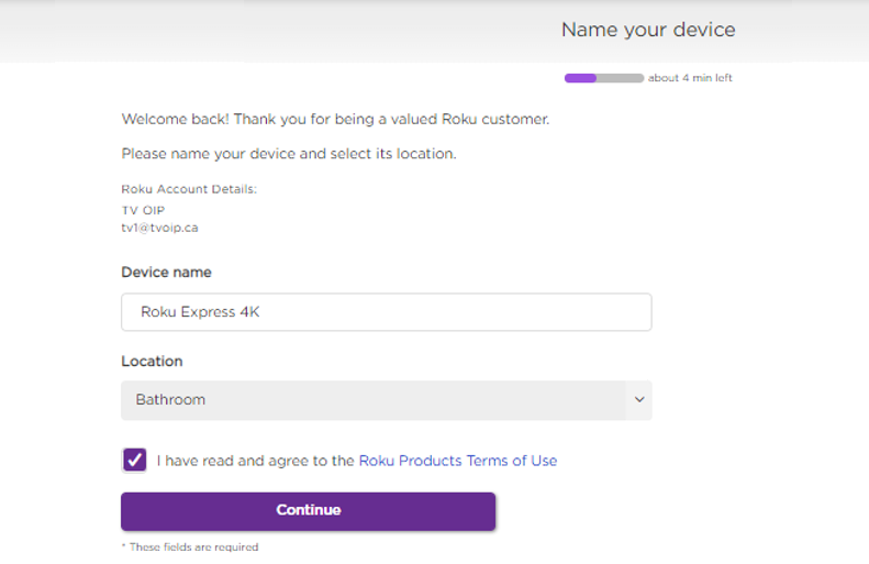 Step 7. Customize your Roku device and set Device name and Location. Optionally, you can add extra channels (Apps) to your Roku unit and click on Continue.