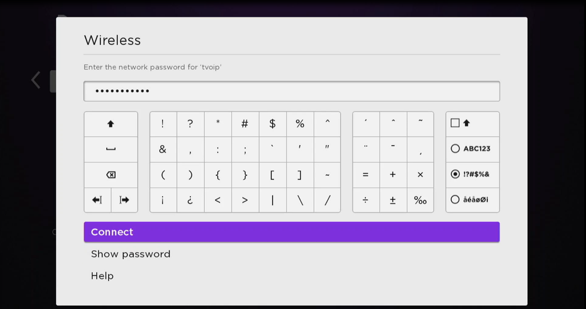 Step 2. Here, you need to connect to a wireless network. Select your Netwire Fiber wireless network using the Up or Down arrows on your remote and then pressing OK. Next, enter the wireless password via the on-screen keyboard and press OK (wireless keys/passwords are case sensitive).